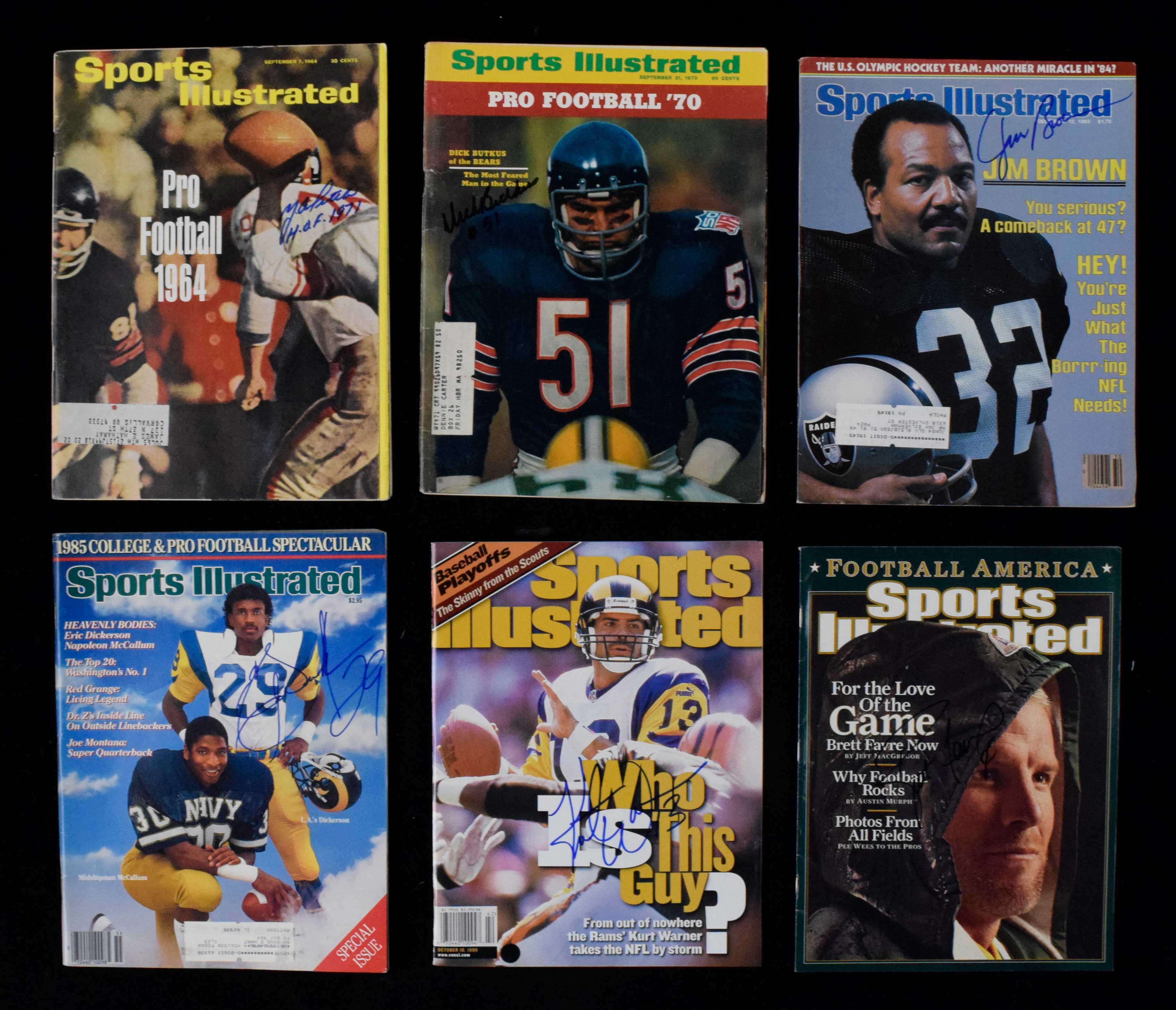 Description:Lot of (6) Hall of Famer autographed issues of Sports Illustrated. Nice selection of issues dating from 1964-2006 with signers including Jim Brown, Brett Favre, Kurt Warner, Dick Butkus, Eric Dickerson, and Y.A. Tittle. Marker signatures rate 8 to 9 out of 10. Mild scattered handling and age related wear is more pronounced in a few cases and some have mailing labels. Includes auction LOA from JSA: Sigs. NM, Magazines VG-EX/MT