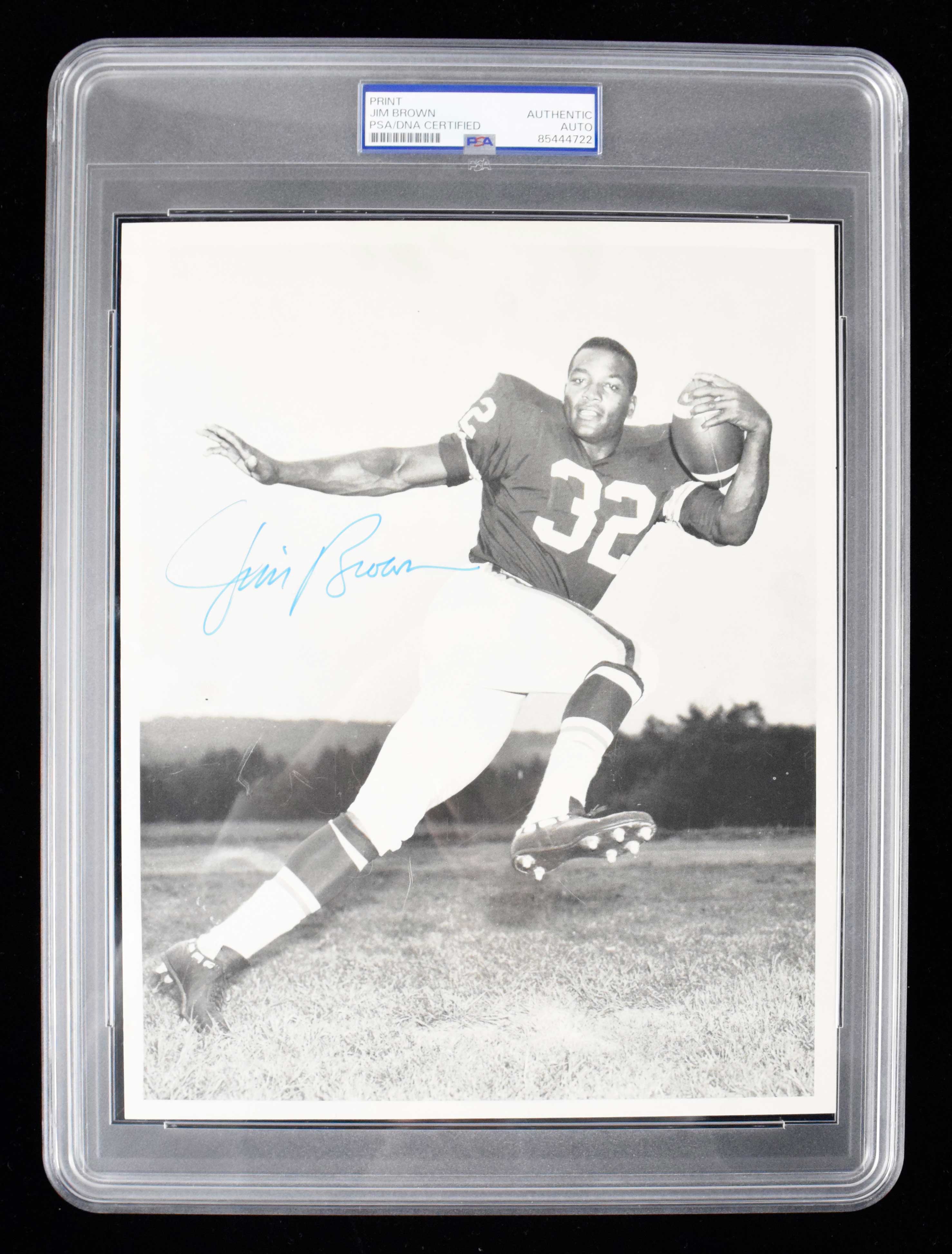 Description:Jim Brown autographed vintage 8"x10" photograph. Career-era print possibly issued as a premium or supplement. Brown signed his image in blue marker. Signature rates 9 out of 10. Authenticated and encapsulated by PSA. Minimal wear other than what appear to be light fingerprints at the right edge: EX/MT