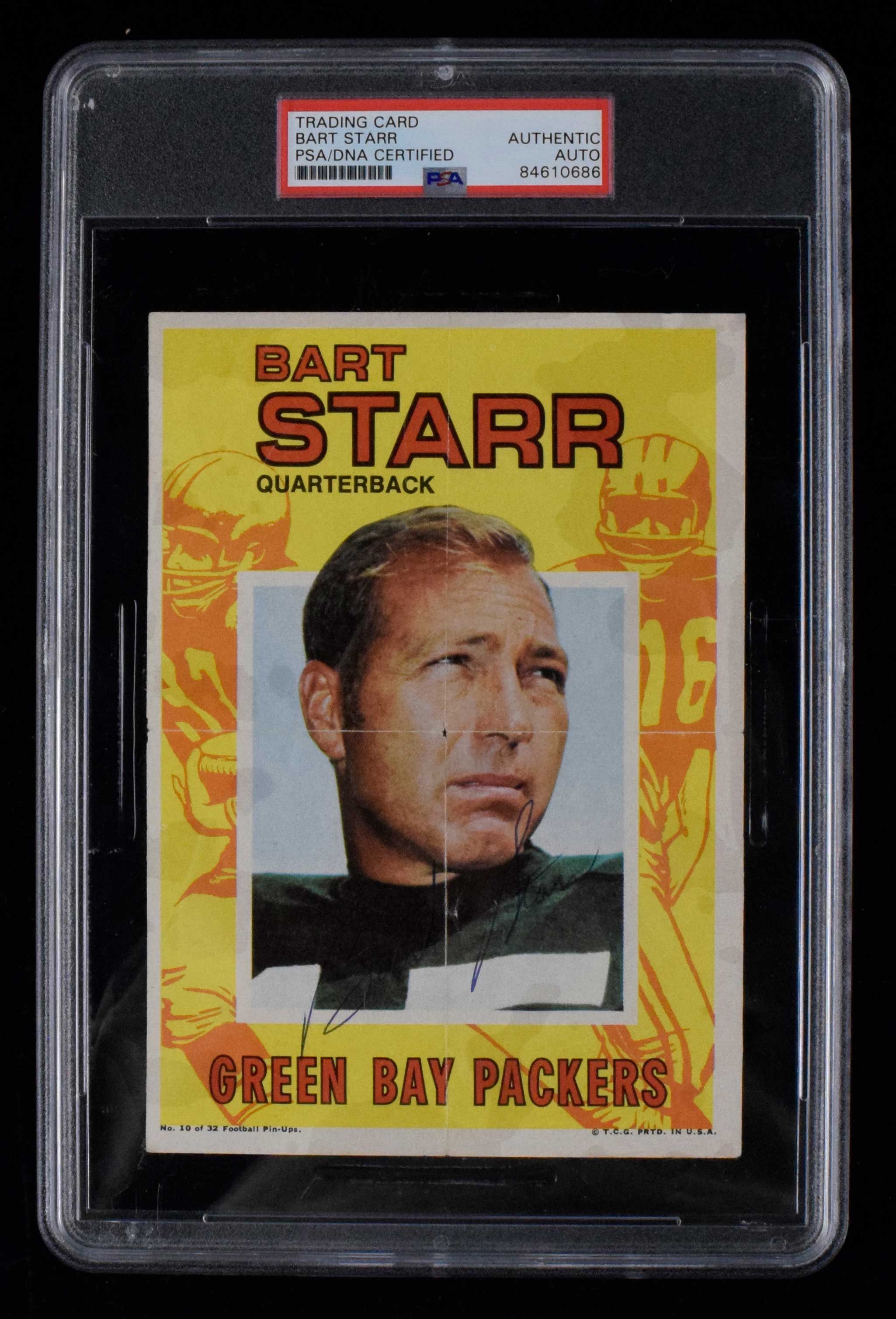 Bart Starr autographed 1971 Topps Pin-Up. Pin-Up #10 signed by Starr in blue ink. Signature rates 8 out of 10. Authenticated and encapsulated by PSA/DNA. Normal fold creases: EX