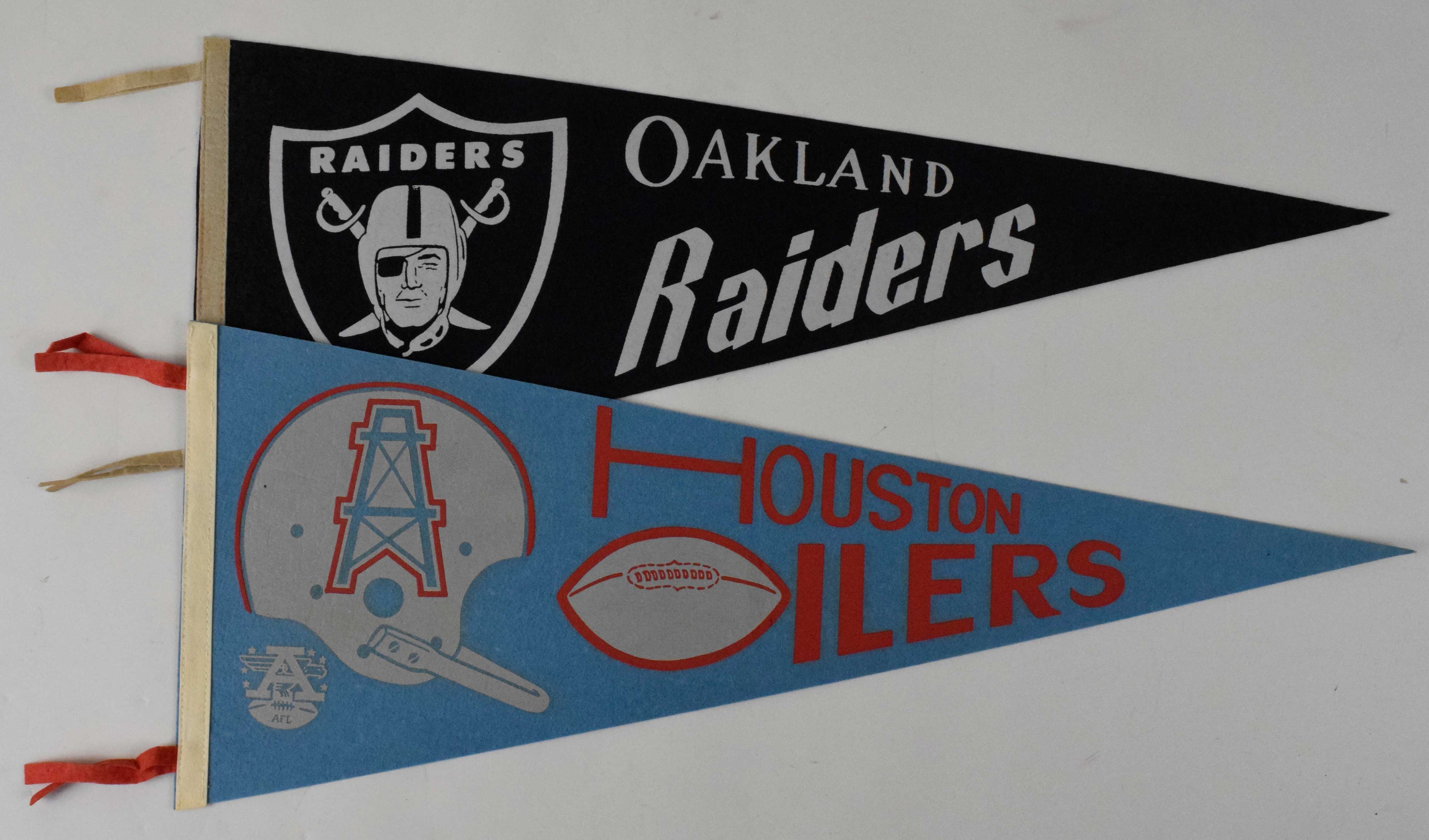 Houston Oilers and Oakland Raiders vintage AFL pennants. Both measure approx. 29.5", and have the AFL logo at the bottom left corner. Oilers EX/MT, Raiders: EX
