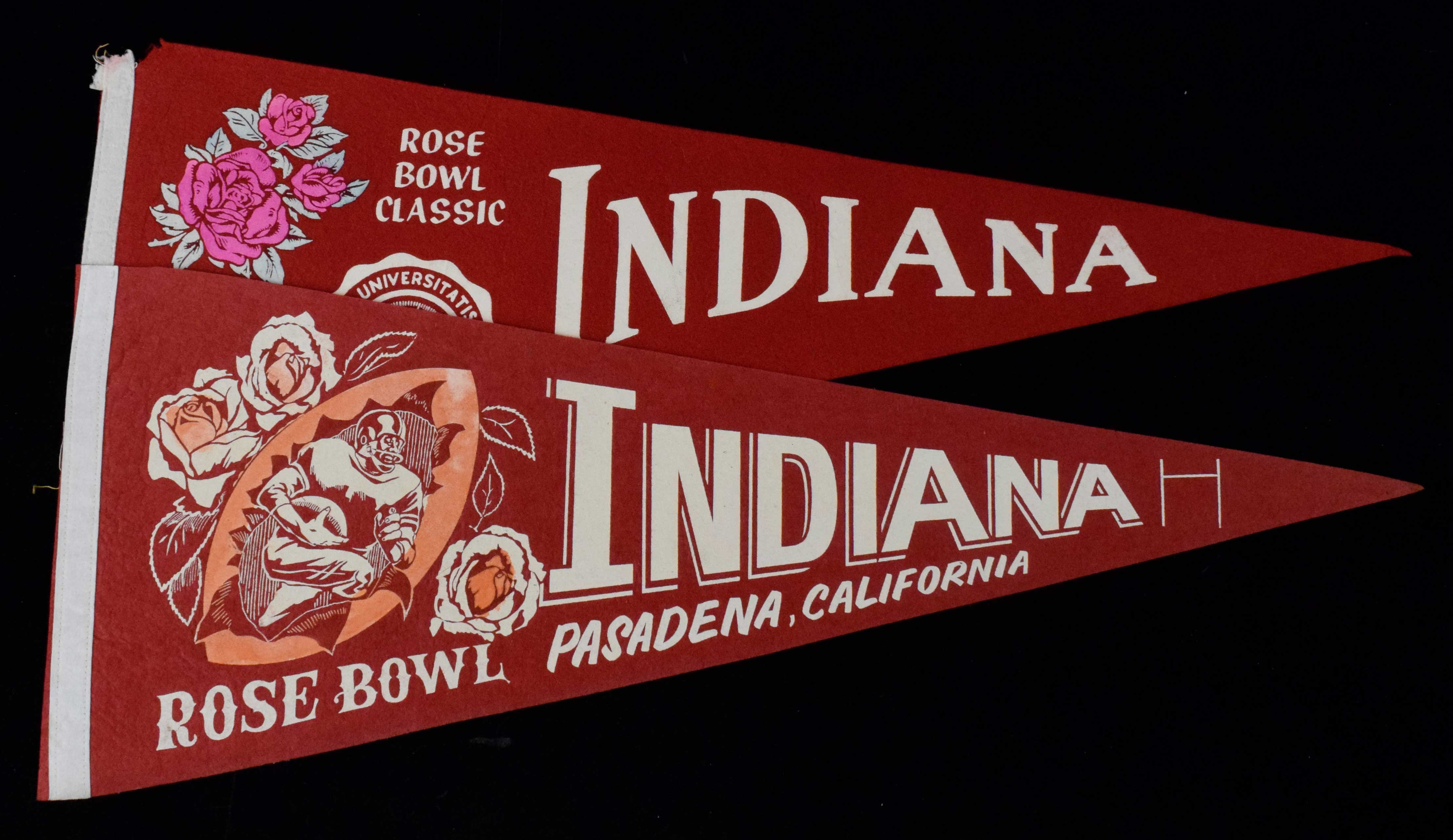 Lot of (2) different Indiana Hoosiers 1968 Rose Bowl pennants. Includes 29.5" pennant with football player graphic (EX/MT-NM), and 30" pennant with pink rose graphics (VG).