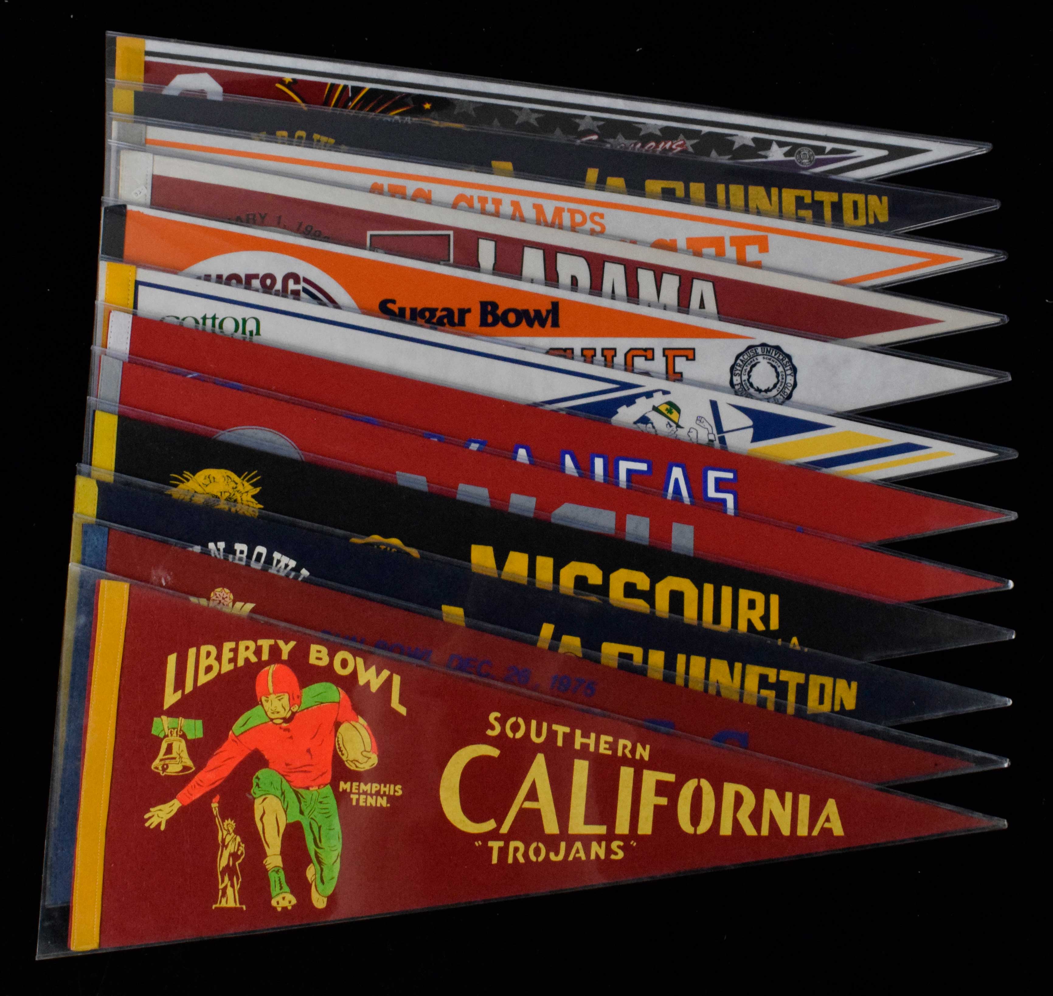 Description:Lot of (12) college football bowl game pennants from 1975-2004. All are full size pennants. Includes USC Trojans 1975 Liberty Bowl, Kansas Jayhawks 1975 Sun Bowl, (2) different 1979 Washington Huskies, Missouri Tigers 1979 Hall Of Fame Bowl, Washington State Cougars 1981 Holiday Bowl, Kansas Jayhawks 1981 Hall Of Fame Bowl, Notre Dame Fighting Irish 1988 Cotton Bowl, Syracuse Orangemen 1988 Sugar Bowl, Alabama Crimson Tide 1990 Sugar Bowl, Tennessee Volunteers 1991 Sugar Bowl, and LSU Tigers vs Oklahoma Sooners 2004 Sugar Bowl. Most appear to average EX/MT-NM overall. Range: VG/EX-NM/MT