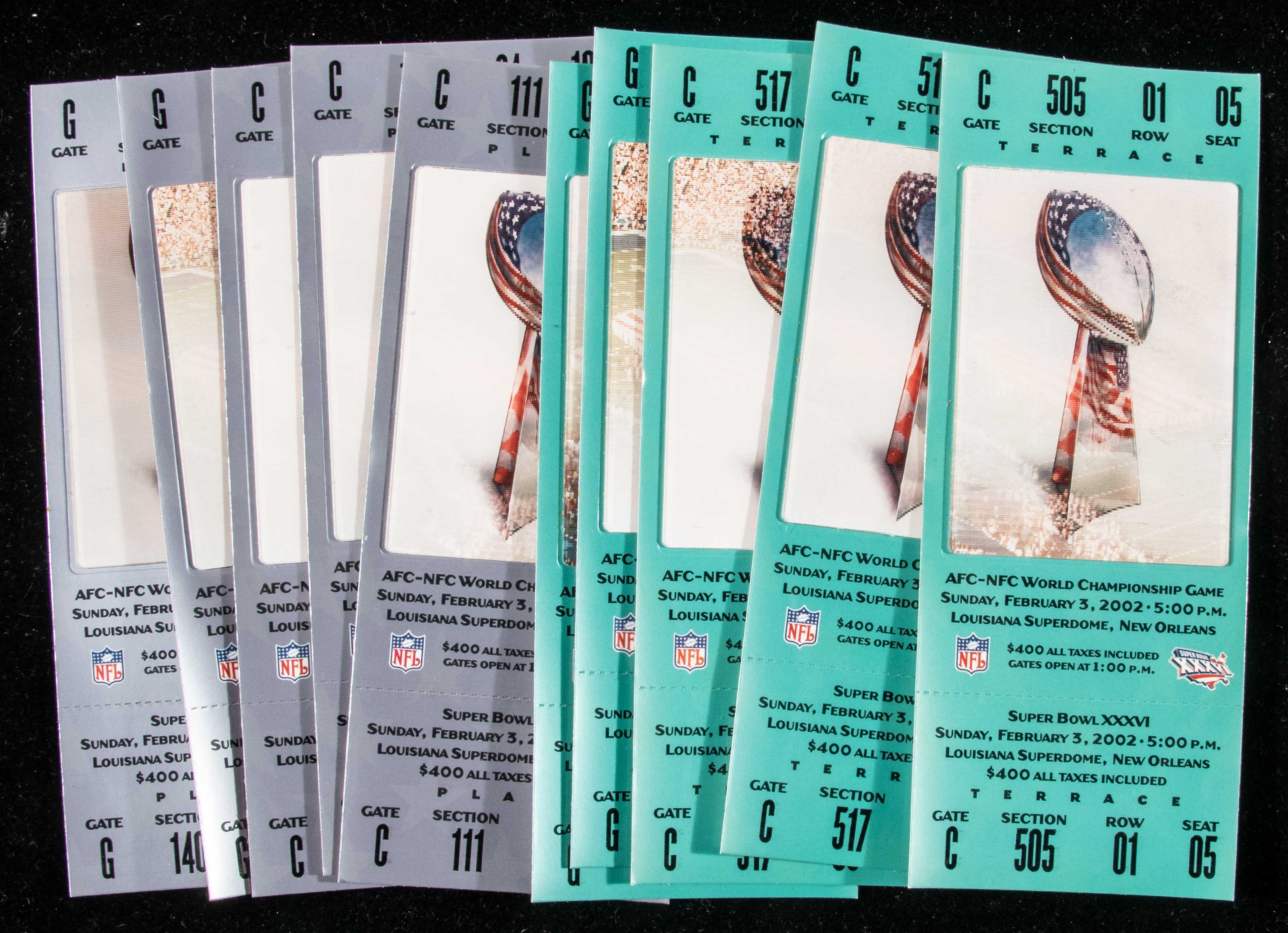 Description:Lot of (10) Super Bowl XXXVI full tickets (Patriots/Brady 1st Super Bowl win). Includes (10) 2/3/2002 full tickets for Super Bowl XXXVI in which the New England Patriots defeated the St. Louis Rams by a score of 20-17 (5 green and 5 silver versions). Most appear to average EX/MT-NM overall. Range: EX-NM/MT