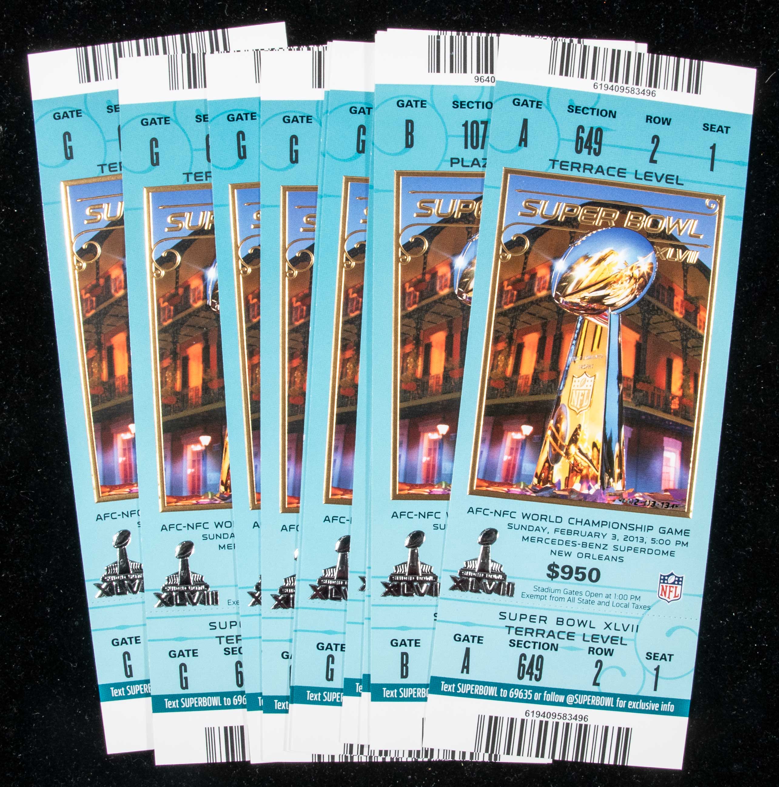 Lot of (10) Super Bowl XLVII full tickets. Includes (10) 2/3/2013 full tickets for Super Bowl XLVII in which the Baltimore Ravens defeated the San Francisco 49ers by a score of 34-31. Most appear to average NM overall. Range: EX/MT-NM/MT
