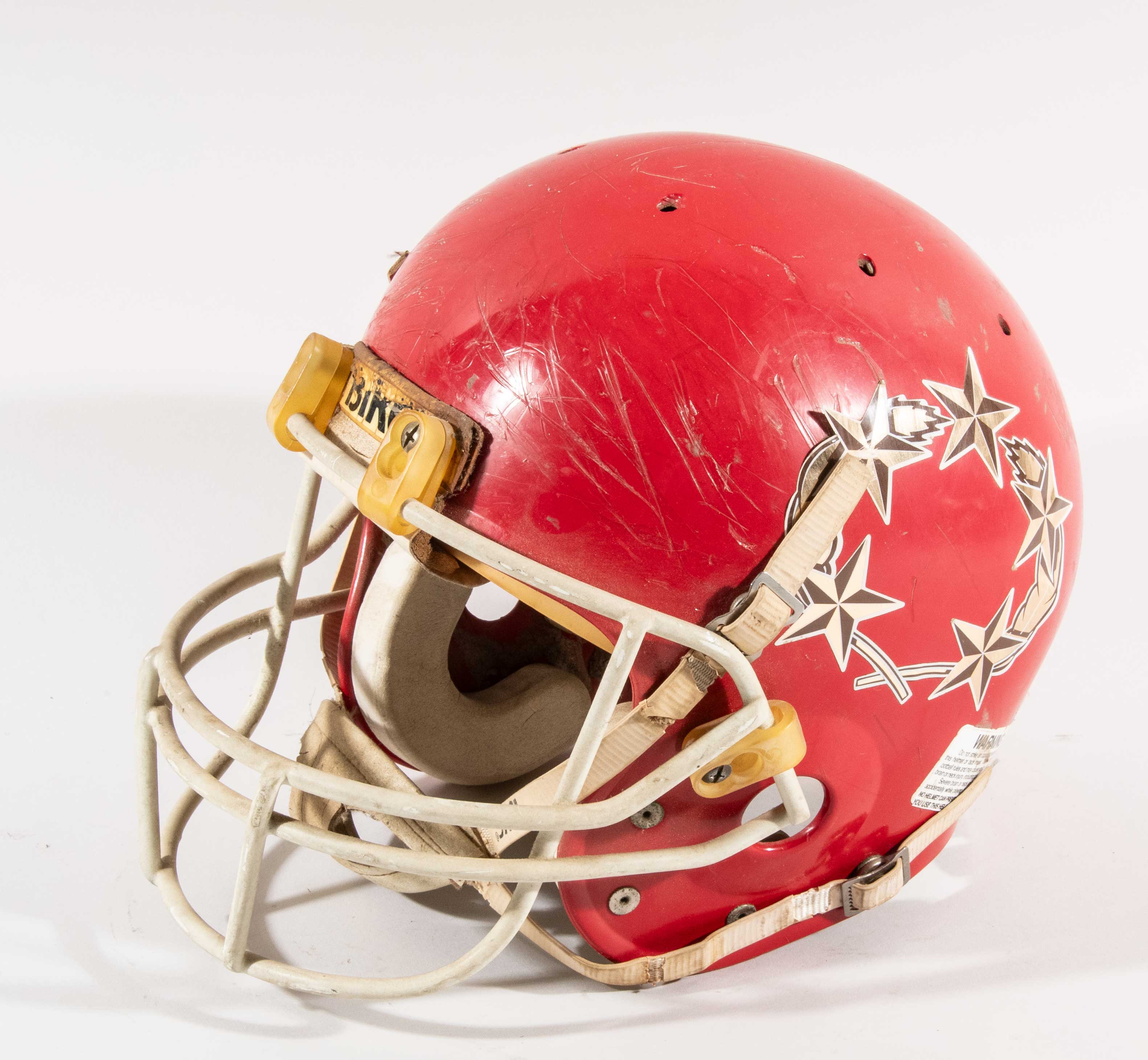 Description:New Jersey Generals professional model USFL helmet c.1983-85. Bike brand Generals helmet with #29 written inside along with other numbers crossed out. Immense use with countless scratches on the surface of the crown. Includes LOA from Hunt Auctions: EX