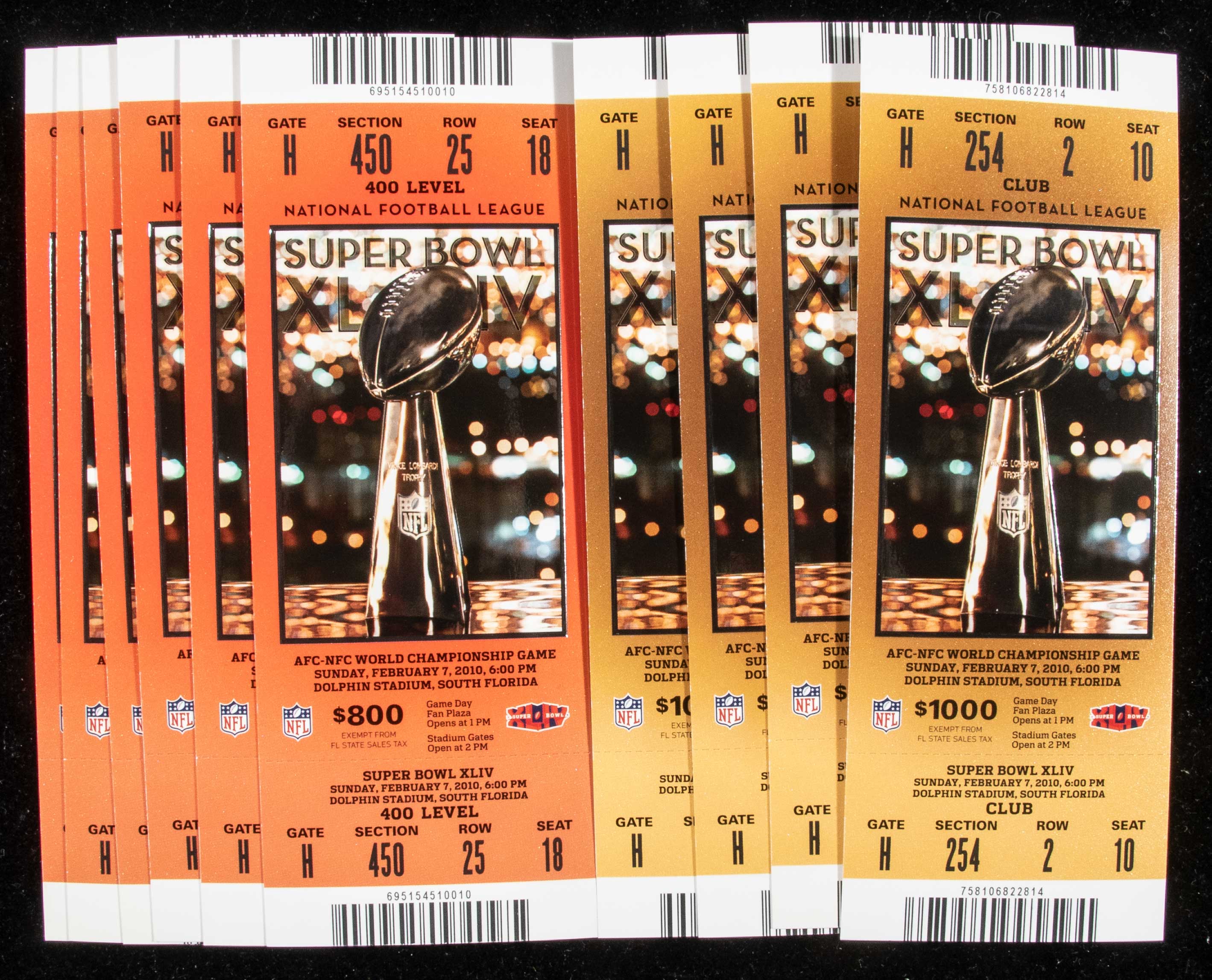 Description:Lot of (10) Super Bowl XLIV full tickets. Includes (10) 2/7/2010 full tickets for Super Bowl XLIV in which the New Orleans Saints defeated the Indianapolis Colts by a score of 31-17 (4 gold and 6 orange versions). Most appear to average NM overall. Range: EX/MT-NM/MT