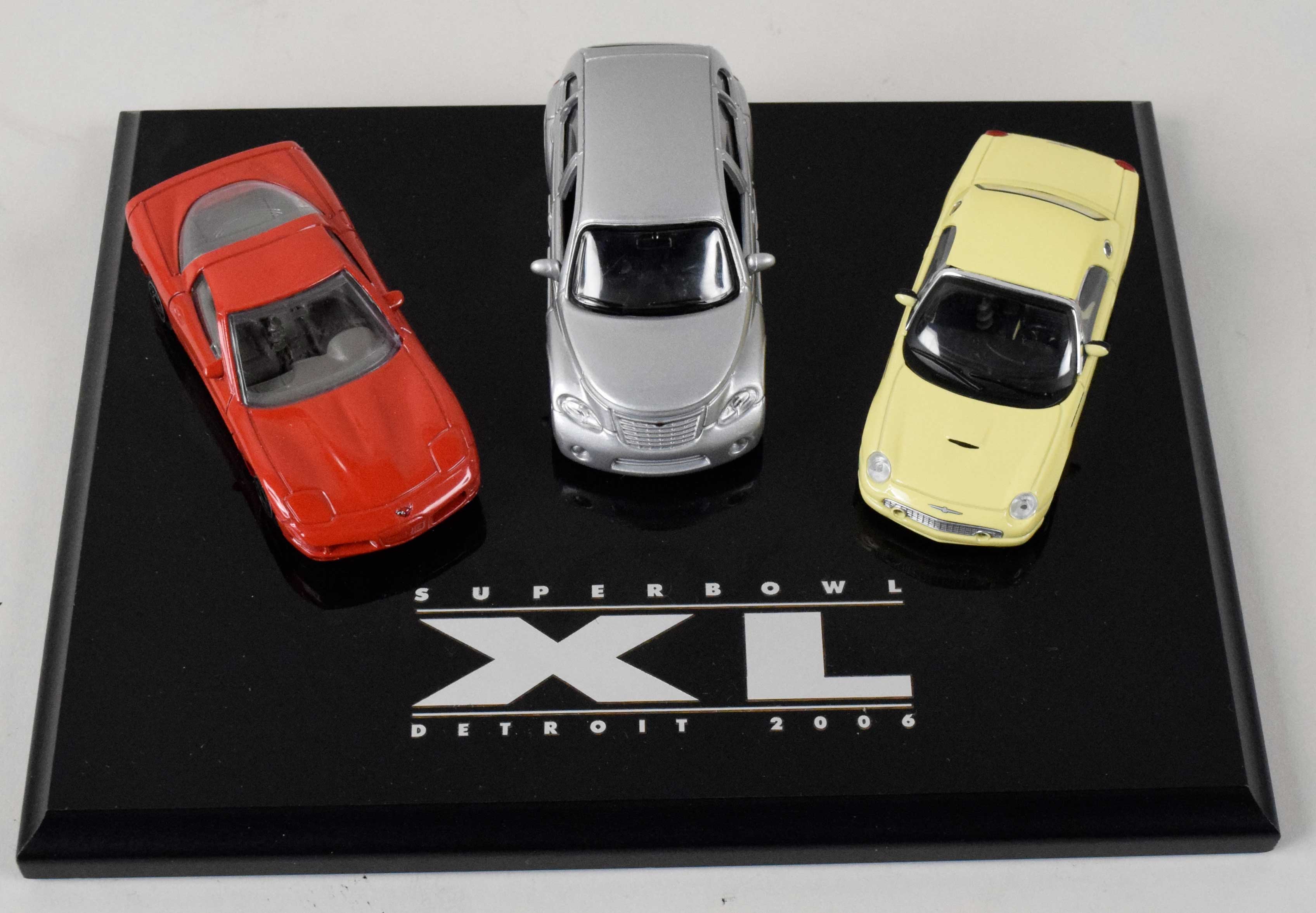 2006 Super Bowl XL display piece. Approx. 8"x10" base with Detroit's Super Bowl logo and (3) die-cast cars sitting atop. Minimal wear: NM