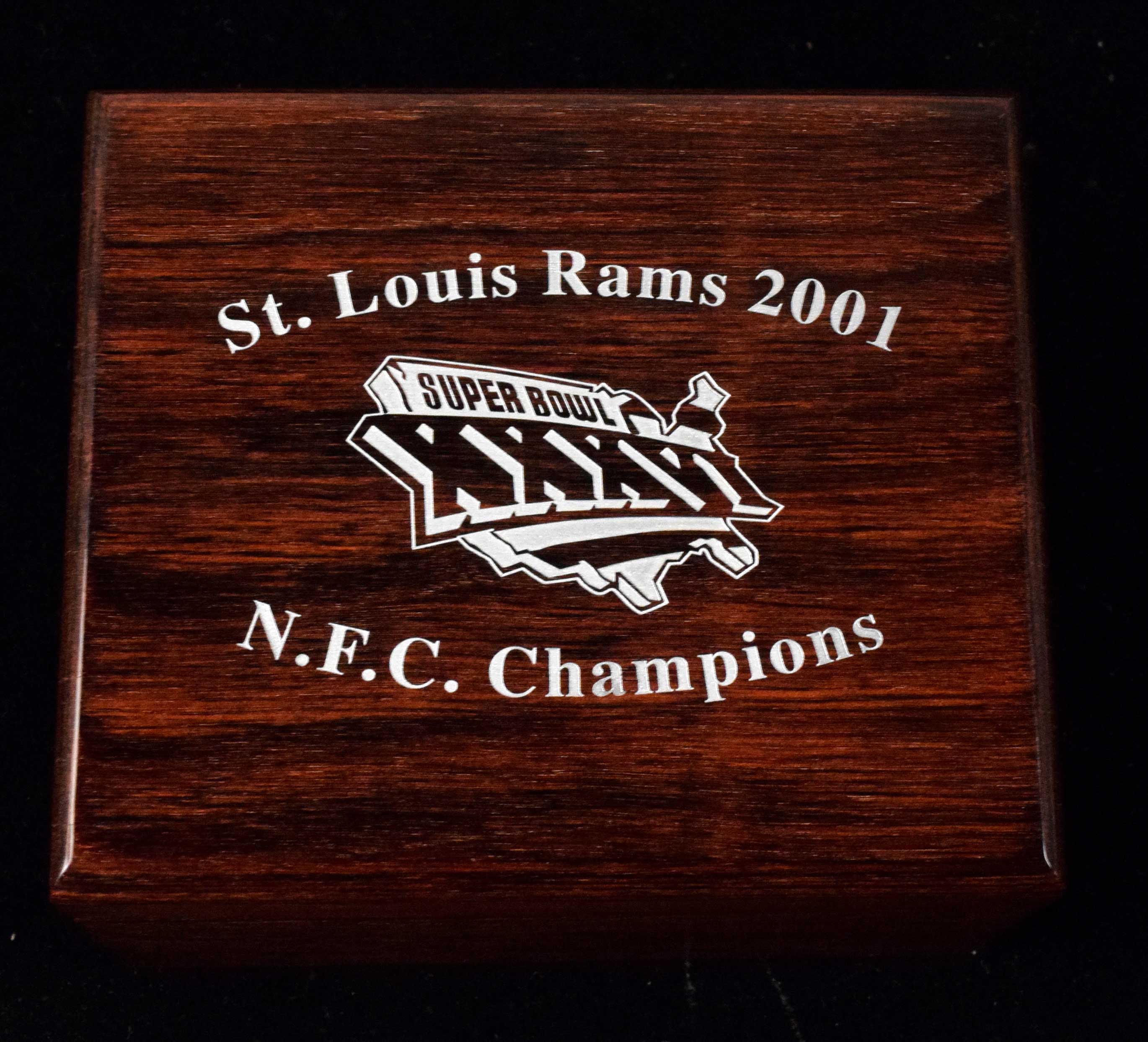 St. Louis Rams 2001 NFC Championship ring box. Original box from Jostens which once held a Rams championship ring issued following the Super Bowl. Minimal wear: NM