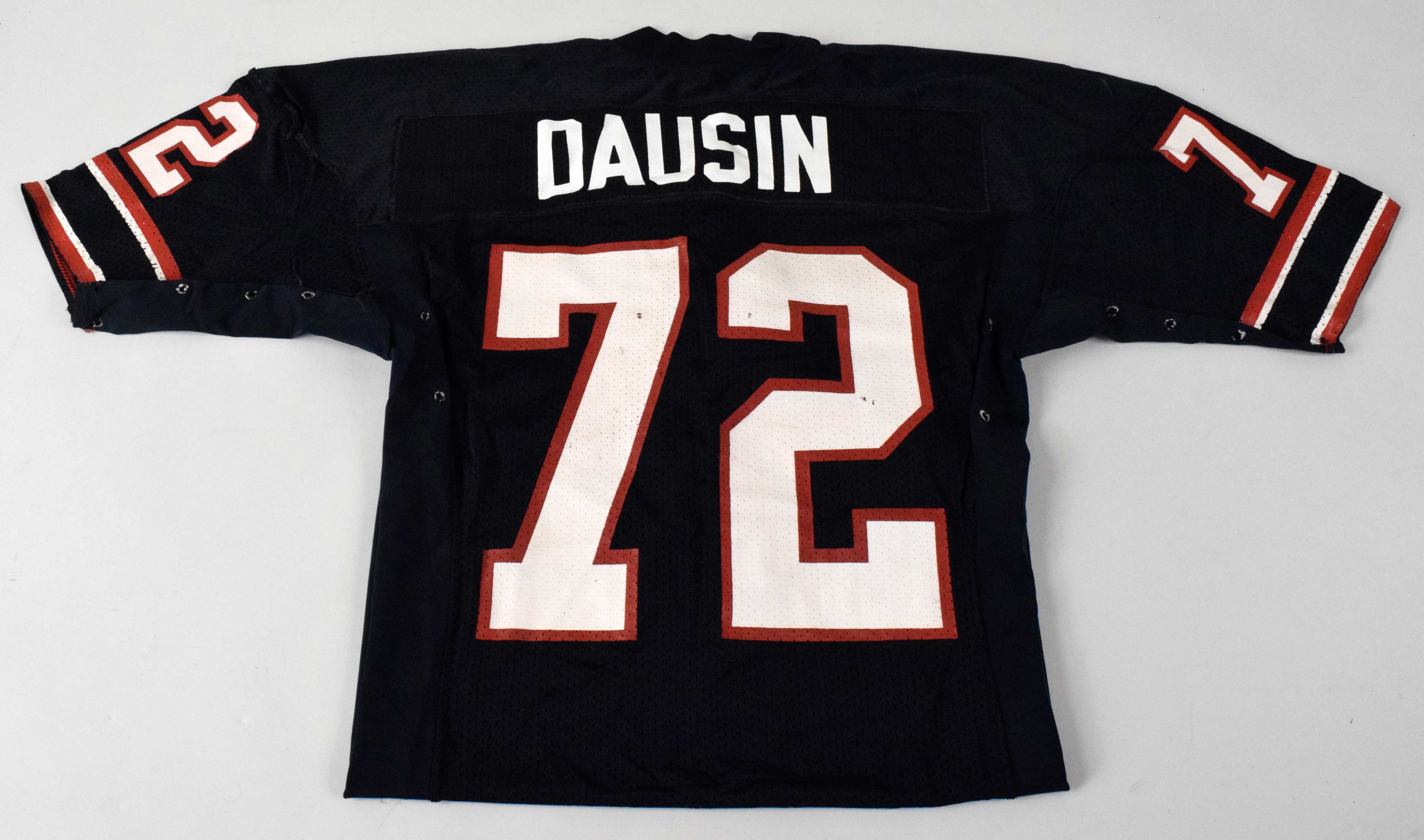 Description:Bryan Dausin professional model Houston Gamblers USFL jersey c.1984-85 (team repairs). Russell Athletic size 48 black jersey with "DAUSIN" nameplate sewn across the back, along with #72 on the front, back, and sleeves. Made with ventilation holes up and down the sides, and a crotch strap on the tail which has Russell Athletic tag adjacent. Excellent use including multiple team repairs on both shoulders. Includes LOA from Hunt Auctions: EX