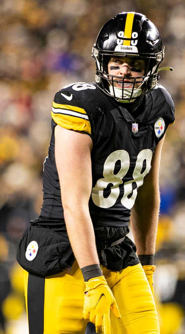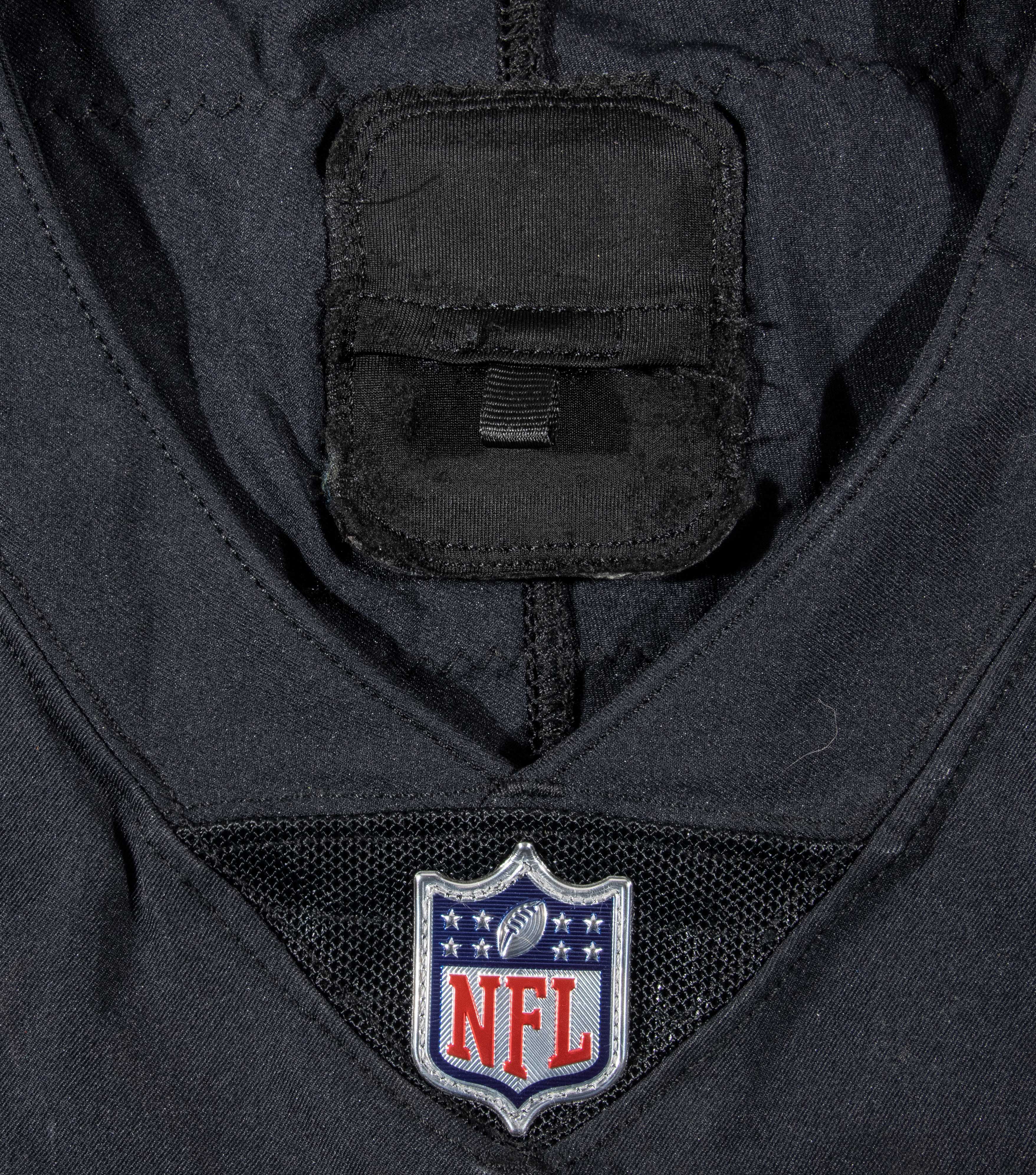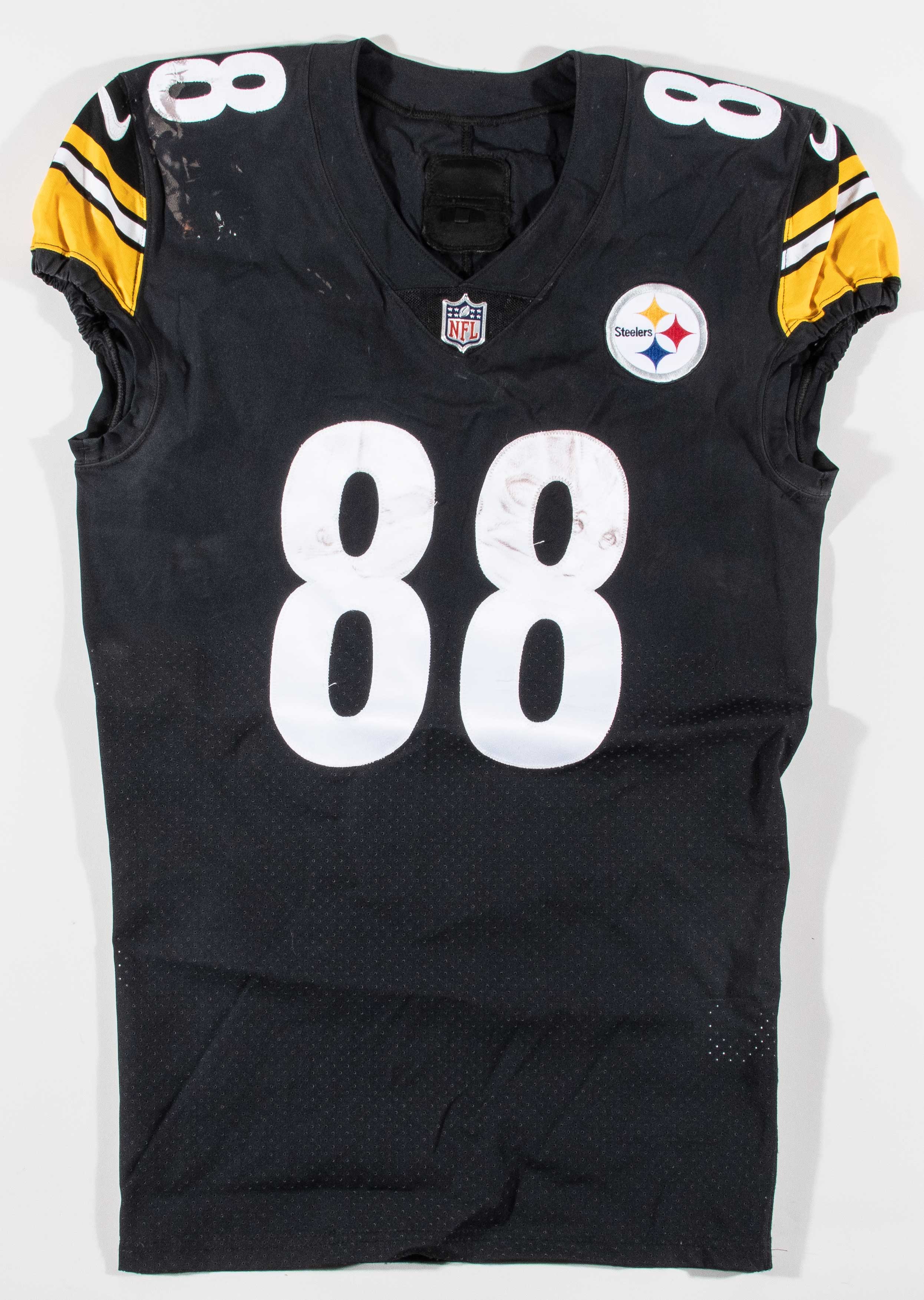 Description:1/3/2022 rookie year Pat Freiermuth professional model Pittsburgh Steelers game worn jersey (strong use, Getty photo match, Steelers Pro Shop authentication). Black mesh jersey has number "88" on the front, back, and shoulders. There is a "Freiermuth" nameplate across the back. Nike On Field L-BK tag in the collar (along with supplemental flag tags) is covered by a custom padded pouch which was likely added to hold a covid detector or contact tracing device. Wash tag inside has affixed "Steelers Authentic Memorabilia" hologram (number GU-116385) and their online database confirms it was game used on January 3, 2022 (5-receptions for 22-yards vs Browns). Strong use is evident throughout, and staining on the front numbers appears to be an exact match of an image taken of Freiermuth during the game played at Heinz Field (Getty: 1237590464): EX
