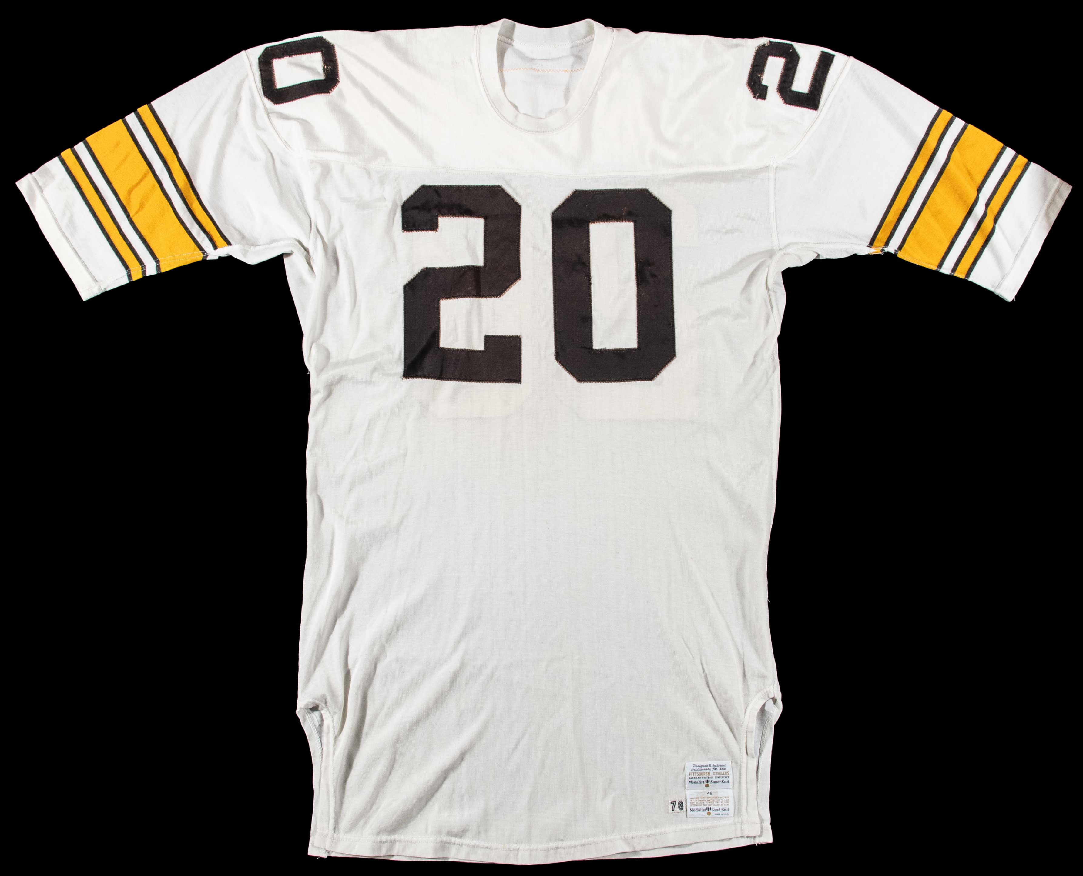 Description:Very fine 1978 Rocky Bleier professional model Pittsburgh Steelers game worn jersey (Super Bowl championship season, Art Rooney II signed letter & MeiGray photomatch). White jersey with black and yellow sleeve accent stripes has number "20" on the front, back, and shoulders. A "BLEIER" nameplate is on the back. Medalist Sand-Knit "Designed & Tailored Exclusively…" tag is on the front tail with an additional below noting size (46). Printed "78" year tag is to one side. Strong use and wash wear are evident throughout including multiple team repairs. MeiGray photomatched the jersey to their 12/16/1978 game vs Broncos (2-receptions for 9-yards plus 11-yards rushing). In addition, it is accompanied by a letter signed by Art Rooney II confirming it was used, and stating that it long resided in the Steelers equipment repository. Bleier's story is the stuff of legend, having been drafted into service following his rookie season. He returned from Vietnam wounded and unable to walk, told that his days playing football were over. Not one to relent, he regained his abilities and would go on the become one of the most popular members of the 1970s Steelers dynasty. He would play on all (4) of their Steel Curtain era Super Bowl Championship teams. Includes photomatch documentation from MeiGray in addition to the LOA signed by Rooney: EX