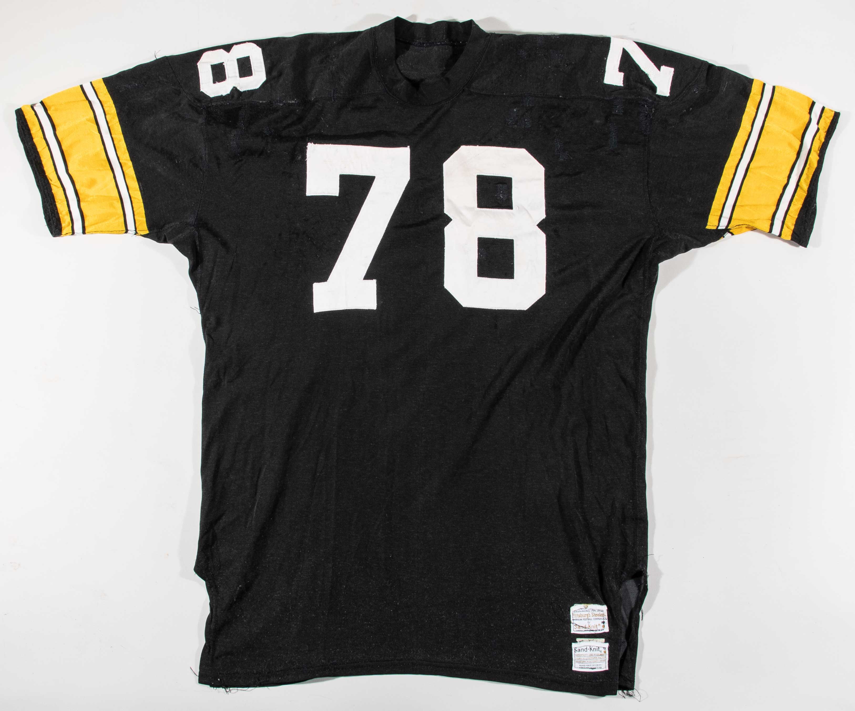 Description:Dwight White professional model Pittsburgh Steelers game worn jersey c.1972 (extensive wear & team repairs, Steelers Pro Shop authentication, Art Rooney II letter, MeiGray). Black jersey has number "78" on the front, back, and shoulders and here is a "White" nameplate across the back. Sand-Knit "Designed & Tailored Exclusively..." tag is on the front tail with additional below noting size (52). Incredible use is evident throughout including numerous team repairs which cover a large area of the upper portion. "Steelers Authentic Memorabilia" hologram affixed inside (number GU-111609) can be confirmed in their database as "game used." Includes a letter signed by Art Rooney II which further confirms the same, along with LOA from MeiGray (serial #160204) noting the jersey's game use. White was a member of the famed Steel curtain defense which helped power the Steelers to (4) Super Bowl Championships. He remains one of the most beloved players in Franchise history: EX