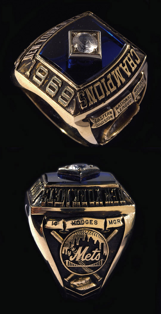 Description:Gil Hodges 1969 New York Mets Salesman's Sample World Series ring. Attractive 10K gold ring features a central cz gemstone inset onto a blue field. "New York Mets World Champions 1969" lettering is found around the perimeter at the top. One side panel has Shea Stadium graphic with titled pennants above. The other side panel features Mets logo with "14 Hodges Mgr." inscribed on a pennant above. Marked "Josten 10K" on the interior ring band along with "S3592" engraving. Size 10.5: NM