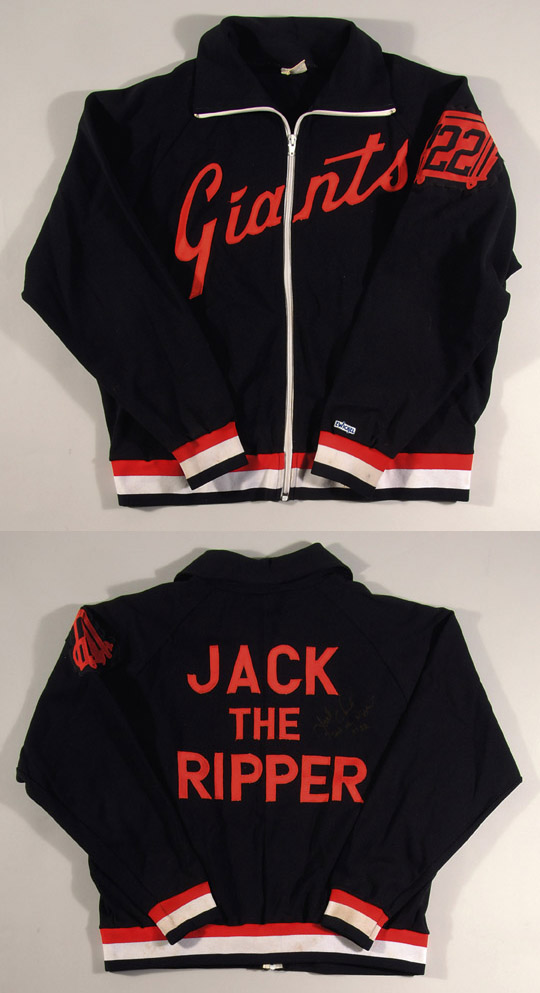 Description:Jack Clark auto. San Francisco Giants professional model warm-up jacket c.1970s. Black zip-front team jacket features Giants lettering on front and trolley car patch on left sleeve bearing #22. Custom lettering stitched on back reads "Jack The Ripper". Zwickel manufacturer's flag tag appears in collar with additional Zwickel tag screened on bottom of left sleeve. Jack Clark has signed the back in gold marker with added notation "Jack The Ripper #22". The jacket exhibits moderate usage wear. A classic, seldom seen style. Includes LOAs from Hunt Auctions (jacket) and JSA (auto.): EX-MT