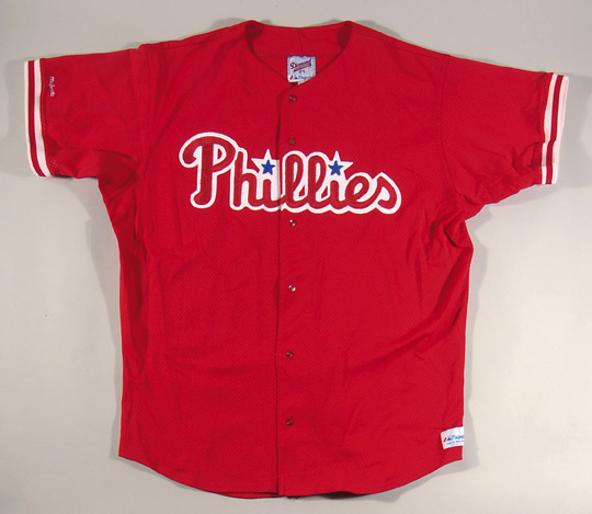 Description:Curt Schilling auto. Philadelphia Phillies professional model practice jersey c.1990s. Red mesh shirt features Phillies lettering on front with player #38 stitched on back. Majestic tagging is stitched in the collar with adjacent flag tag noting size "50". Separate Majestic tag is stitched on front tail. Schilling has signed the back number in black sharpie. Shirt exhibits moderate usage wear. Includes LOAs from Hunt Auctions (jersey) and JSA (auto.): EX-MT