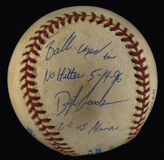 Description:Dwight Gooden No Hit game used baseball. G.Budig AL ball was used in the May 14, 1996 game played between the New York Yankees and Seattle Mariners in which Dwight Gooden threw a no hitter. The ball exhibits evident game use and has been inscribed, "Ball used in No Hitter 5-14-96 Dwight Gooden 2-0 vs. Mariners". Includes LOA from JSA and letter of provenance signed by Dwight Gooden: EX-MT