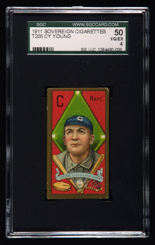 1911 T-205 Cy Young. Attractive card with light even corner wear and strong original color: SGC 50 VG/EX