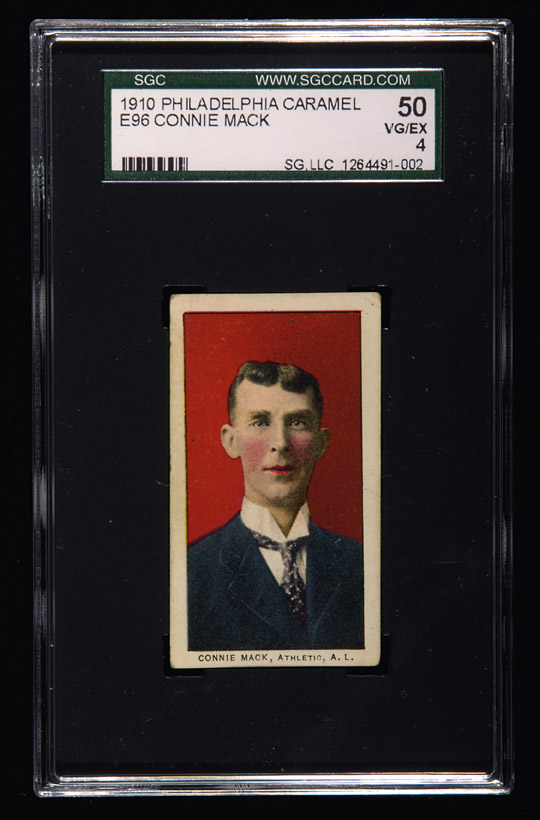 1910 E96 Philadelphia Caramel Connie Mack. Very attractive card with brilliant color and light even corner wear: SGC 50 VG/EX