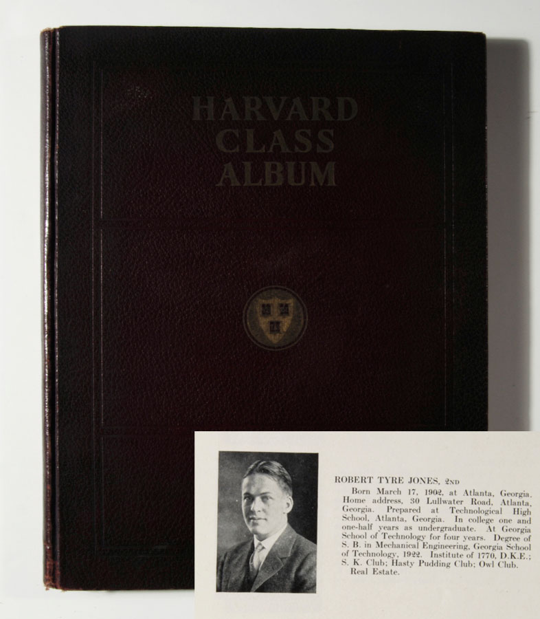 Description:1924 Bobby Jones Harvard Class Album (VG/EX) Large format 11"x14" hardbound publication with Jones pictured as a Senior on page 192. Exhibits exterior handling wear and interior age toning: VG/EX