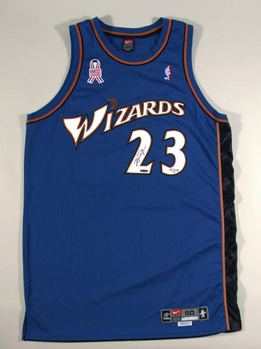 Description:UDA Michael Jordan autographed limited edition Washington Bullets throwback jersey. Nike size 48 Bullets jersey displays the number "23" stitched on front and back along with "JORDAN" stitched on back. Jordan signed the jersey in silver marker. Signature rates 10 out of 10. Hand numbered "57/100". Includes LOA from JSA and Upper Deck Authenticated COA: NM