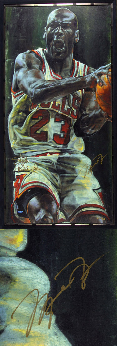 Description:Michael Jordan "Game Time" autographed artist's proof giclee by artist Stephen Holland. This limited edition giclee on canvas rendering of Michael Jordan measures 22"x45" and is signed by both the subject and artist in vibrant gold ink. Titled "Game Time", this scarce artist's proof is hand numbered "A.P. 5/23" from a very limited edition of 23 pieces. Stephen Holland is one of the nation's foremost contemporary sport artists, with this being among his most famous works. A UDA hologram is present on the lower left corner, however the accompanying certificate is absent. Framed to overall size of 27"x50". Includes a LOA from JSA: NM-MT