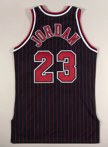 Description:UDA Michael Jordan autographed 1995-96 Chicago Bulls black pinstriped jersey commemorating Bulls 72-10 record. Black mesh Chicago Bulls pinstriped Champion replica jersey is signed by Jordan in black ink on the back number with his added inscription "72-10"
