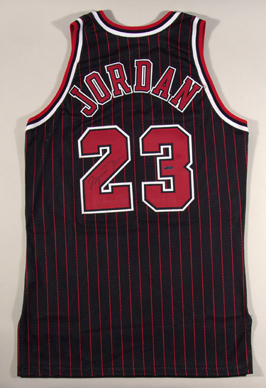 Description:UDA Michael Jordan autographed 1995-96 Chicago Bulls black pinstriped jersey. Black mesh Chicago Bulls pinstriped Champion replica jersey is signed by Jordan in black ink on the back number. Signature rates 9-10 out of 10. Includes COA from UDA and LOA from JSA: NM-MT