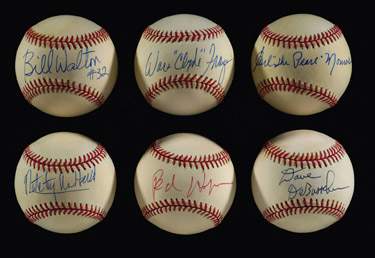 Description:Lot of (6) Basketball HOF'er single-signed baseballs. Balls are either W.White NL or B.Brown AL baseballs. Autographs include Nate Tiny Archibald, Dave DeBusschere, Walt "Clyde" Frazier, Earl "The Pearl" Monroe, Bill Walton with added "#32" inscription, and Red Holzman. Ink signatures rate 9-10 out of 10. Balls exhibit very light toning. Includes LOA from JSA: Range EX/MT-NM