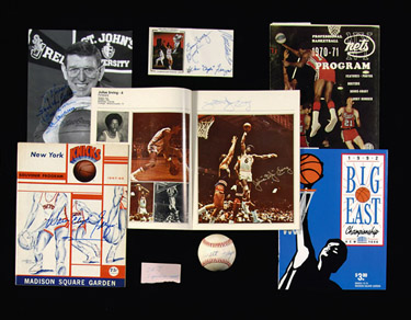 Description:Collection of basketball autographed materials. Total of (21) pieces to include Walt Frazier signed baseball, Julius Erving auto. program, Walt Frazier signed 1967-68 Knicks program, DePaul Univ. signed programs, and numerous Lou Carnesecca signed programs. Includes LOA from JSA: Range VG-NM