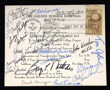 Description:Naismith Basketball Hall of Fame autographed inaugural invitation. Vintage 5"x6" invitation to the HOF Commemoration postmarked Nov. 6, 1961 is signed by approx. (20) players including George Mikan, Paul Arizin, Tom Gola, John Havlicek, John Wooden, and Slater Martin. Includes LOA from JSA: NM