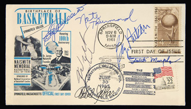 1961 Naismith Basketball Hall of Fame autographed FDC. Commemorative first day cover postmarked Nov. 6, 1961 is signed by (6) players including Wilt Chamberlain, George Mikan, Abdul Jabbar, and Nate Thurmond. Includes LOA from JSA: EX-MT