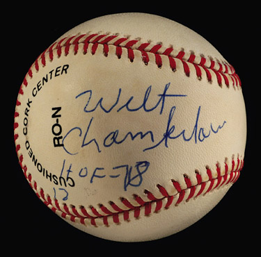Description:Rare Wilt Chamberlain autographed baseball. Rawlings official NL Coleman baseball is signed on the side panel by Chamberlain in blue ink with his added notation "HOF - 78". Signature rates 10 out of 10. Ball is clean with only a couple of small areas of soiling. First example that we have handled. Includes LOA from JSA: NM