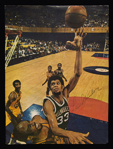Description:Lew Alcindor autographed magazine photo. 8 1/4"x11" printed image of Alcindor administering his patented sky hook as a member of the Milwaukee Bucks. Black felt tip ink signature rates 8 out of 10. In 1971, several years after converting to Islam, Alcindor changed his name to Kareem Abdul-Jabbar. Includes LOA from JSA: EX-MT