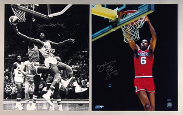 Description:Lot of (2) Julius Erving autographed 16"x20" photographs. Includes black and white ABA image of Dr.J in action, signed by Erving in silver marker rating 10 out of 10. Incl. Tri-Star COA (serial #ed hologram sticker is affixed); and Color photo of Dr.J dunking, signed by Erving in silver marker rating 10 out of 10. Includes LOA from JSA and COA from GT Sports Marketing (hologram sticker is affixed): NM