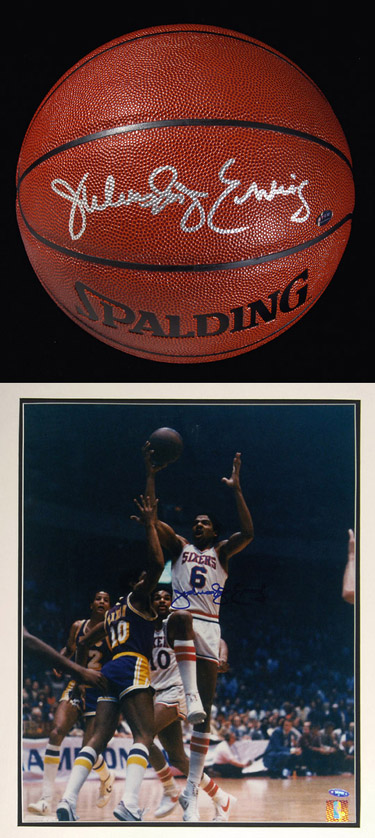 Description:Julius "Dr. J" Erving autographed basketball and photograph. Includes Spalding NBA model ball signed across the front in silver sharpie: NM and 16"x20" color photograph signed in blue sharpie (matted and framed). Includes COA from Tri Star (photo), Holograms from Julius Erving and Global Authentication (ball), and LOA from JSA: NM