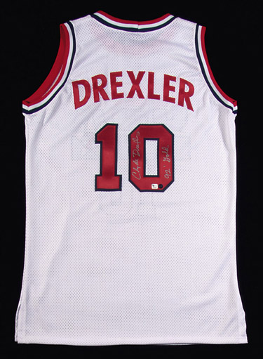 Clyde Drexler autographed USA Olympic basketball jersey. Replica jersey is signed by Drexler across the back in silver sharpie along with "92 Gold" notation. Includes LOA from JSA and COA from Global Authentication: NM