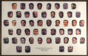 Description:1996 NBA's 50 Greatest Players lithograph. In conjunction with the NBAÆs 50th Anniversary in 1996, the NBA named itÆs 50 greatest players. Remarkably, 49 of the 50 players selected were alive and present when they were honored as part of the 1996-97 All-Star festivities. The celebration included the unveiling of a limited series of these 25öx39ö lithographs, 250 of which were signed by the players. Printed on the highest quality acid-free paper, this unsigned version bears the images of all of the 50 greatest players as selected by the NBA itself. The offered example features the embossed Field of Dreams logo at the lower left and NBA 50th Anniversary logo at lower right. It is framed to museum standards with an engraved descriptive plaque at the bottom. Overall size 40"x53": NM-MT