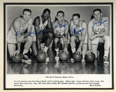 Description:1960 Boston Celtics starting five autographed photo. Framed vintage 8"x10" photograph features the starting five for the 1960 World Champion Boston Celtics including Heinsohn, Russell, Cousy, Sharman and Ramsay. Each has signed the photo in blue sharpie. Signatures rate 9-10 out of 10. Includes LOA from JSA: NM