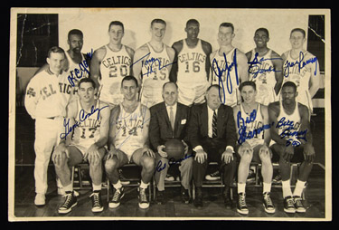 Description:1958-59 Boston Celtics team autographed photo. Vintage 9"x14" photograph captures the 1958-59 NBA Champions. Ten of the subjects pictured have signed the photo incl. Cousy, Aurbach, Russell, Sharman, K.C. Jones, Heinsohn, Loscutoff, Sam Jones and Ramsay. Signatures rate 8-9 out of 10. Photo shows scattered creasing and edge wear. Includes LOA from JSA: VG/EX