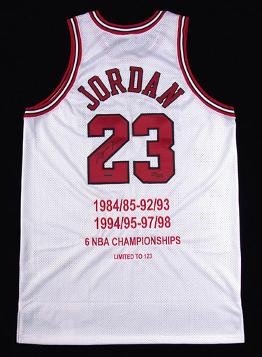 Description:UDA Michael Jordan autographed limited edition Chicago Bulls jersey. Nike size 50 Bulls jersey displays the number "23" stitched on front and back along with "JORDAN" stitched on back. Jordan signed the jersey in black marker. Signature rates 10 out of 10. Hand numbered "107/123". Embroidery on back tail of jersey reads "1984/85-92/93", "1994/95-97/98", "6 NBA Championships", and "Limited To 123". Includes LOA from JSA and Upper Deck Authenticated COA: NM