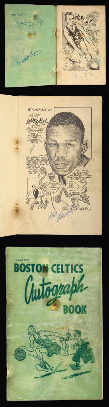 Description:1956-57 Boston Celtics autograph book incl. Bill Russell rookie signature. Scarce early Celtics autograph book measures 5öx8ö. Interior pages feature individual caricature renderings autographed by all the Celtics players in the period including Auerbach, Russell (rookie year), Cousy, Heinsohn (rookie), Loscutoff, Sharman, Ramsey, Hemric, Nichols, Phillip and Risen. Additional signatures of former Celtics team owner Walter Brown and Hall of Fame announcer Johnny Most also appear on the inside cover. The latter portion of the book features additional autographed caricature pages representing other stars of the league such as Paul Arizin (taped cut), Bob Pettit (taped cut), Dolph Schayes, Carl Braun, Neil Johnston and Ken Sears. The gem here is the Russell page, as it is rare to find an autograph by him that can be definitively attributed to his rookie season. Book shows moderate staining and soiling throughout with some interior pages loosened from spine. Signatures average 9 out of 10. Includes LOA from JSA: VG/EX-EX