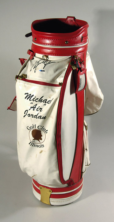 Description:Michael Jordan autographed personal golf bag. Wilson golf custom made red and white leather/vinyl golf bag features "Michael Air Jordan" in black lettering across the front along with "Golf Club of Illinois". The bag has been signed by Jordan in black sharpie on the front panel. The bag itself appears to show evident usage wear with some surface soiling. Bag retains its original tag with "M. Jordan" i.d. label along with its original leather rain hood. The offered golf bag originated from the personal collection of Michael Jordan and includes COA from Upper Deck Authenticated: EX