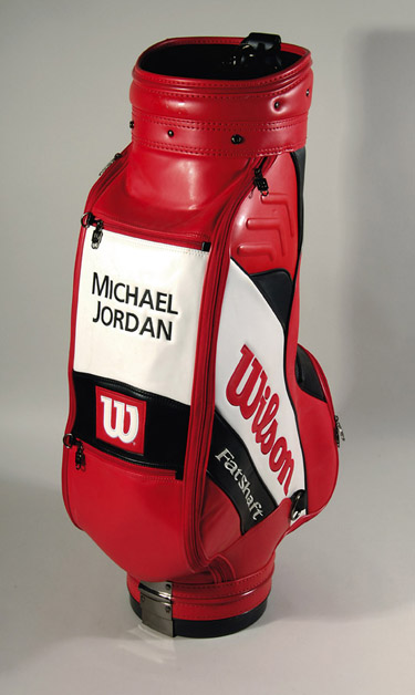 Description:Michael Jordan personal golf bag. Wilson "Fat Shaft" custom made red and white leather/vinyl golf bag features "Michael Jordan" embroidered in black lettering across the front. The bag itself shows no visible usage wear remaining clean overall with fresh original color. The offered golf bag originated from the personal collection of Michael Jordan and includes COA from Upper Deck Authenticated: NM