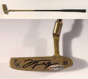 Description:Michael Jordan autographed personal golf club. Custom made putter by Spectrum Golf have "Michael Jordan Celebrity Challenge" printed in gold on the shaft. The side of the putter head has been signed by Jordan in black sharpie alongside his "23" uniform number impressed in black. The offered club originated from the personal collection of Michael Jordan and includes COA from Upper Deck Authenticated: EX-MT