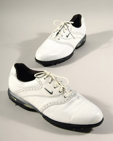 Description:Pair of Michael Jordan personal golf shoes. White leather Nike Air brand custom golf shoes exhibit evident usage wear including course residue to the cleat points on the sole. The offered cleats originated from the personal collection of Michael Jordan and include COA from Upper Deck Authenticated: EX
