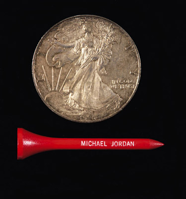Description:Michael Jordan's Silver Dollar and golf tee. Original 1996 U.S. Silver dollar was found within one of the golf bags that Michael Jordan used. The coin shows typical surface and age wear remaining in unpolished original condition. Likely used on a coin flip (or two) during some competitive golf matches. The lot also includes a personalized "Michael Jordan" red wooden golf tee. The offered items originated from the personal collection of Michael Jordan and include two individual COAs from Upper Deck Authenticated (one per item): EX