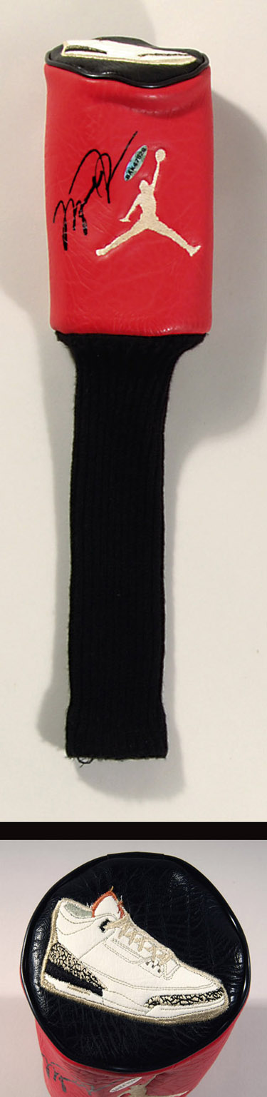 Description:Michael Jordan autographed leather golf club cover. Custom made red leather cover features Michael Jordan "Jumpman" logo across the front with an embossed leather basketball sneaker graphic at the top. Signed across the front by Jordan in black sharpie. The lot also includes one golf club from Michael Jordan's personal collection (unsigned). Both items originated from the personal collection of Michael Jordan and include two individual COAs from Upper Deck Authenticated: EX-MT