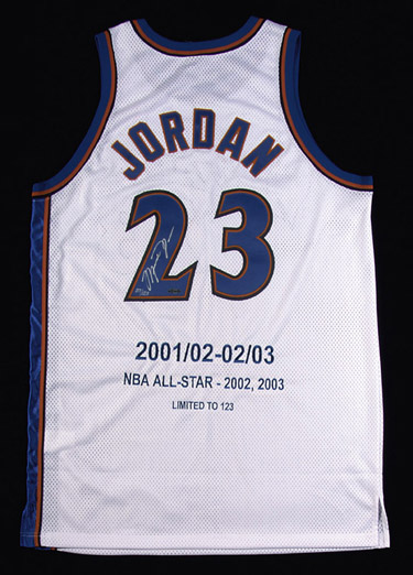 Description:UDA Michael Jordan autographed limited edition Washington Wizards jersey. Nike size 50 Wizards jersey displays the number "23" stitched on front and back along with "JORDAN" stitched on back. Jordan signed the jersey in silver marker. Signature rates 10 out of 10. Hand numbered "107/123". Embroidery on back tail of jersey reads "2001/02-02/03", "NBA All-Star - 2002, 2003", and "Limited To 123". Includes LOA from JSA and Upper Deck Authenticated COA: NM