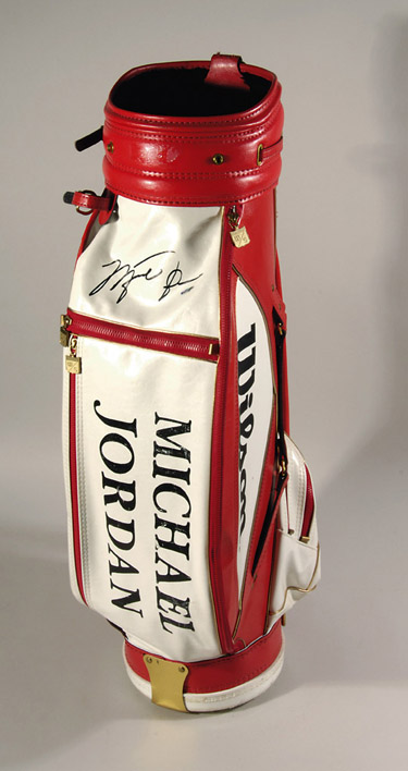 Description:Michael Jordan autographed personal golf bag. Wilson golf custom made red and white leather/vinyl golf bag features "Michael Jordan" in black lettering across the front and shows evident usage wear. Signed by Jordan in black sharpie on the front panel. The offered bag originated from the personal collection of Michael Jordan and includes COA from Upper Deck Authenticated: EX-MT