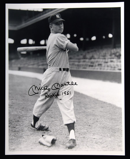 Description:Mickey Mantle autographed photograph. Limited edition 11"x14" black and white image by photographer George Brace pictures Mantle in a batting pose c.1951. Signed in black sharpie, "Mickey Mantle Rookie 1951" rating 10 out of 10. Includes LOA from JSA (autograph) and COA from George Brace (photo): NM-MT